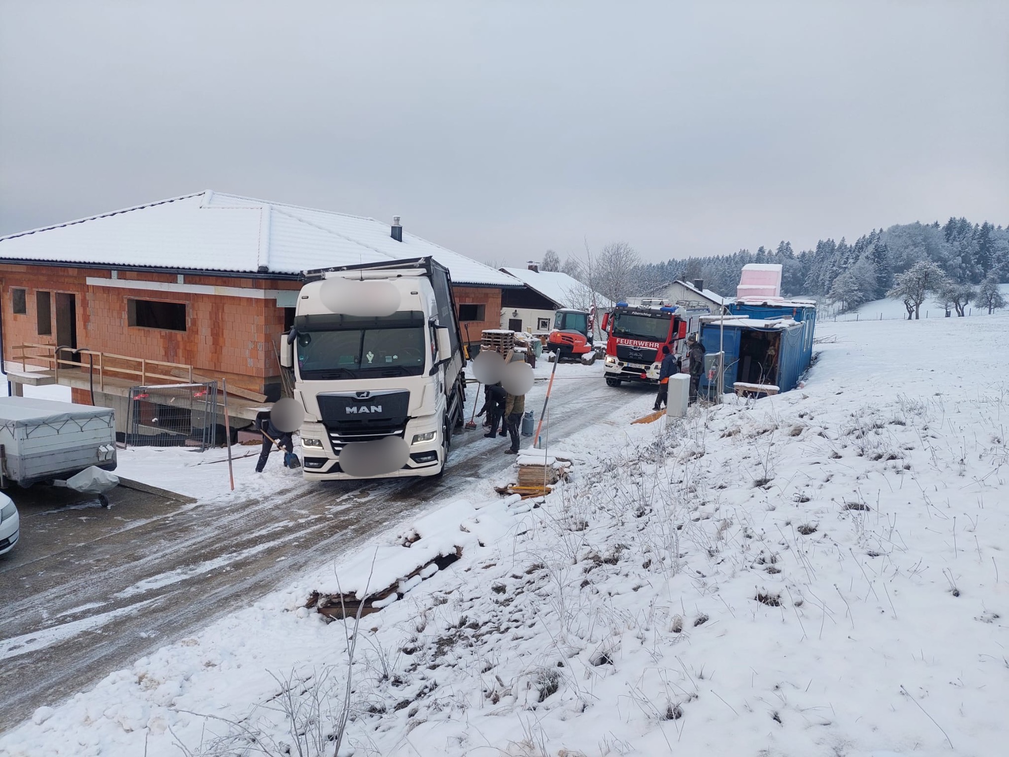 Heute wurden wir telefonisch zu einer LKW-Bergung alarmiert. Ein mit Fenstern beladener LKW rutschte beim Zufahren auf eine Baustelle von der Straße ab und blieb im Gelände stecken.