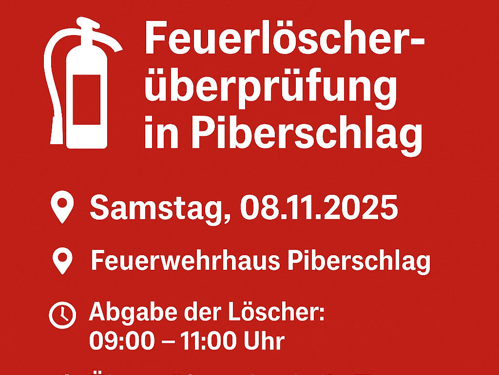 Am Samstag, 08.11.2025 findet wieder die Feuerlöscherüberprüfung bei uns im Feuerwehrhaus Piberschlag statt.